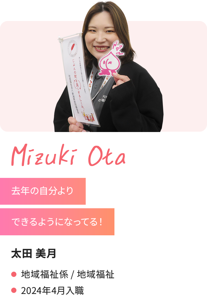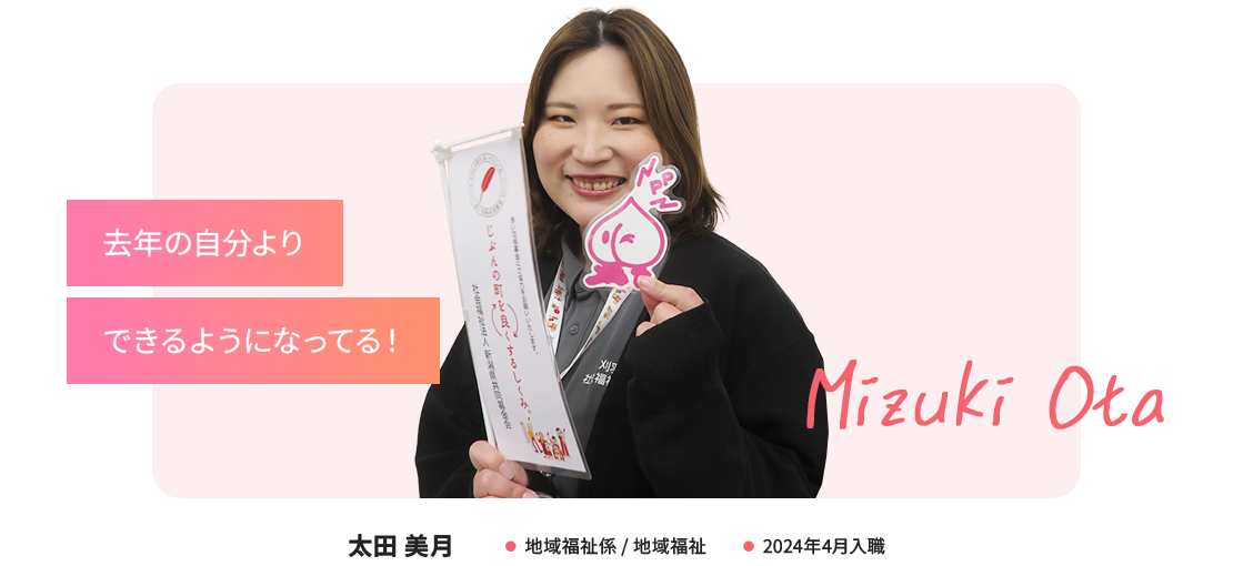 入職のきっかけは、学生時代から地域福祉に興味があり、いつかは社協で仕事がしたいと思っていました。前職は介護現場で働いていましたが、ご縁があって2024年の4月に入職しました。